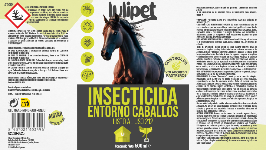 El Insecticida Entorno Caballos es la solución perfecta para mantener a tus caballos y su entorno libre de insectos indeseados. Con una fórmula potenciada, este insecticida combate de manera eficaz tanto insectos voladores como rastreros, asegurando que los establos y áreas de descanso estén protegidos.
